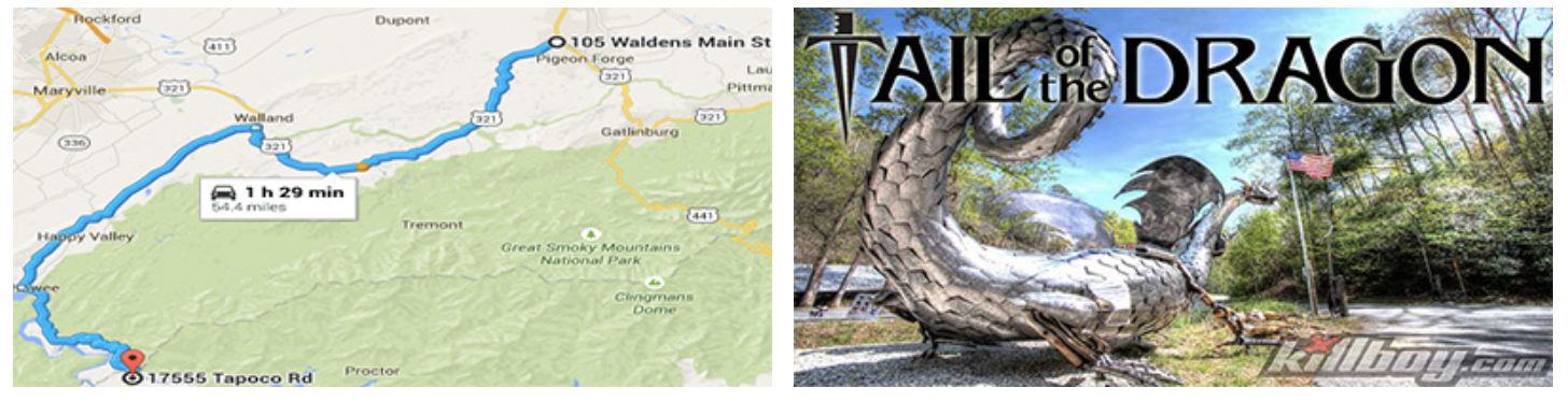 The Tail of the Dragon, also known as Deals Gap or just the Dragon, is considered by many as one of the world's best motorcycling and sports car roads. Located near the Great Smoky Mountains and Cheokee National Forest, this 11 miles strech of road is known well for its over 300 twists and turns! Sounds exciting right? The map image provided will give you an idea of how to ride from our dealership straight to the heart of the trail! Ready to get out and ride? This route caters more to tastes of seasoned and experienced riders, so make sure you are feeling courageous enough to take it on!