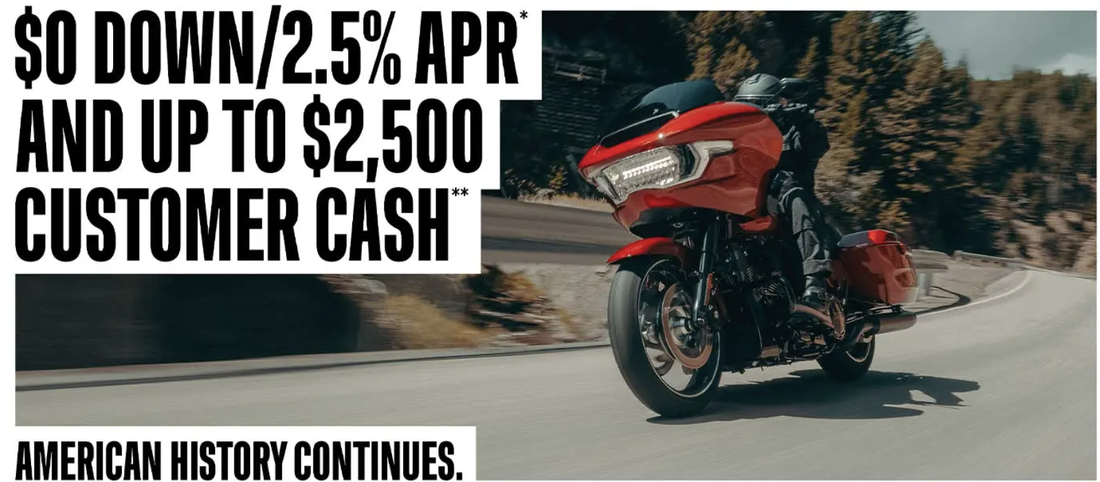 *Financing Offer available only on select, new untitled 2025 or 2024 Street Glide® and Road Glide® or 2025 Street Glide® Ultra Harley-Davidson® motorcycles financed through Eaglemark Savings Bank and is subject to credit approval. Harley-Davidson® CVO™ motorcycles are excluded. Not all applicants will qualify as the Annual Percentage Rate (APR) will vary based on the applicant’s past credit performance and the term of the loan. Financing offer is available only for up to a 36-month term. For example, a 2025 Road Glide motorcycle in Brilliant Red with Black trim and an MSRP of $30,199, no down payment and amount financed of $30,199, 36-month repayment term, and 2.50% APR results in monthly payments of $871.58. In this example, customer is responsible for applicable taxes, title, licensing fees and any other fees or charges at the time of sale. APR is calculated according to the simple interest method. Not valid in conjunction with other offers. Customer must take delivery by March 31, 2026. This Financing Offer is valid during the period of January 1, 2026 to March 31, 2026. Other terms, conditions, and limitations may apply. Dealer participation may vary. Financing offer is subject to change or cancellation at anytime. See dealer for details.